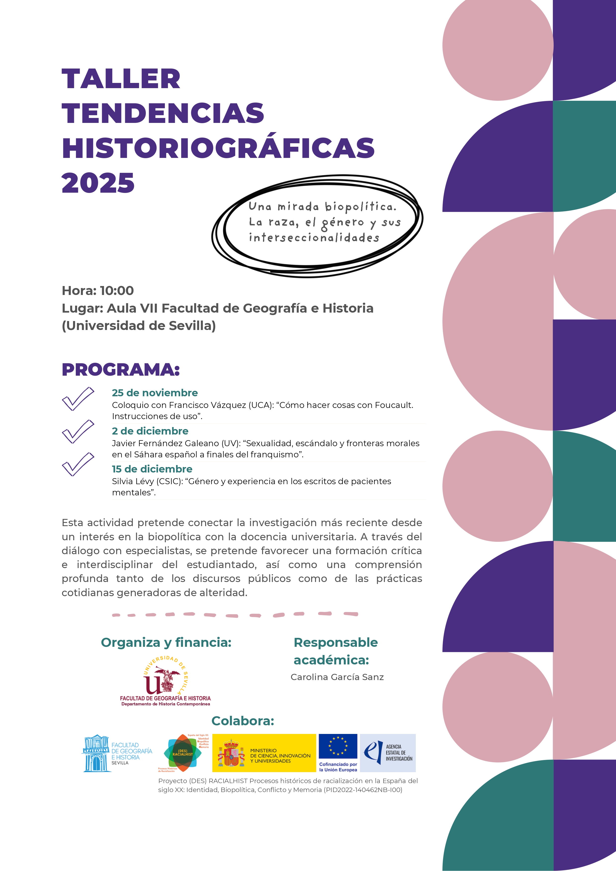 Nuestra IP1, Carolina García Sanz, ha organizado un taller destinado principalmente a los alumnos de la asignatura de Tendencias Historiográficas del Grado en Historia de la Universidad de Sevilla. Esta actividad pretende conectar la investigación más reciente desde un interés en la biopolítica con la docencia universitaria. A través del diálogo con especialistas, se pretende favorecer una formación crítica e interdisciplinar del estudiantado, así como una comprensión profunda tanto de los discursos públicos como de las prácticas cotidianas generadoras de alteridad.