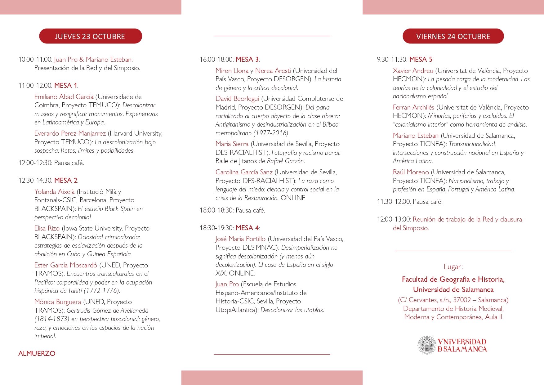 Entre el 23 y 24 de octubre de 2025, la Red DECOLONHIST (Descolonizar la Historia del espacio atlántico) organiza, con la colaboración del Consejo Superior de Investigaciones Científicas (CSIC) y la Facultad de Geografía e Historia de la Universidad de Salamanca, un simposio para presentar la Red, de la que forman parte varios grupos de investigación. Entre estos grupos se encuentra (DES)RACIALHIST, que será representado por nuestras investigadoras principales, Carolina García Sanz y María Sierra.